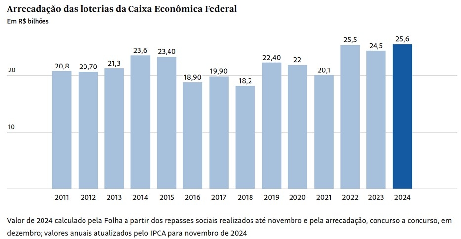 O valor obtido vem no ano em que começou a vigorar a regulamentação das apostas online em cota fixa (as chamadas bets), modelo que concorre com as loterias exploradas pela Caixa por monopólio.