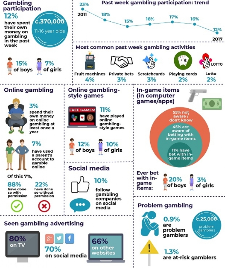 Cerca de 11% dos jovens de 11 a 16 anos jogaram jogos sociais de estilo de jogo gratuitos pela internet na semana passada, enquanto 11% também apostaram ao jogar jogos baseados em computadores ou aplicativos. Para aqueles que jogaram usando dinheiro real, eles gastaram uma média de £ 10.