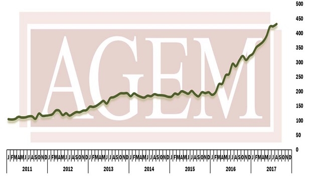 O Índice AGEM é calculado com base no preço do estoque do mês (ajustado para dividendos e divisões) de cada empresa e ponderado com base na aproximação da capitalização de mercado. Baseia-se em um valor de 100 pontos registrado a partir de janeiro de 2005.