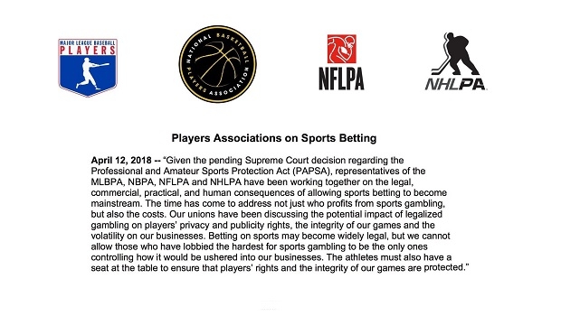 “Dada a decisão pendente da Suprema Corte sobre a PASPA, representantes da MLBPA, NBPA, NFLPA e NHLPA têm trabalhado junto nas conseqüências legais, comerciais, práticas e humanas de permitir que as apostas esportivas se tornem mainstream”, disse o grupo na declaração.