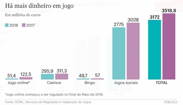 O jogo online veio também dar um forte contributo para as contas das apostas legalizadas em Portugal, já que foi o primeiro ano completo em termos de receitas (a primeira licença foi atribuída em Maio de 2016). De acordo com os dados dos Serviços de Regulação e Inspecção de Jogos (SRIJ), ligados ao Turismo de Portugal, o valor da actividade de jogos e apostas online, explorado por sete entidades (com onze licenças, entre apostas desportivas à cota e jogos de fortuna e azar), gerou 122,5 milhões de euros. Deste valor, a maioria cabe às apostas desportivas, onde se destaca o futebol (77% do total), com 68,1 milhões de euros. Aos jogos de fortuna e azar cabem os outros 54,4 milhões, com as máquinas virtuais em destaque (45%).