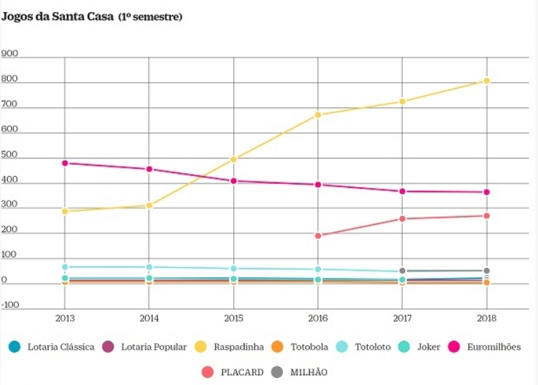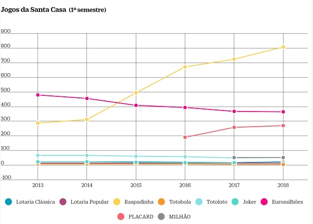 Os números referentes aos primeiros seis meses do ano mostram uma tendência bastante diferente da que estava a acontecer desde 2013: na primeira metade de 2018, o desinteresse das pessoas só recaiu em três jogos - além do já referido Euromilhões, o Totobola e o M1lhão.