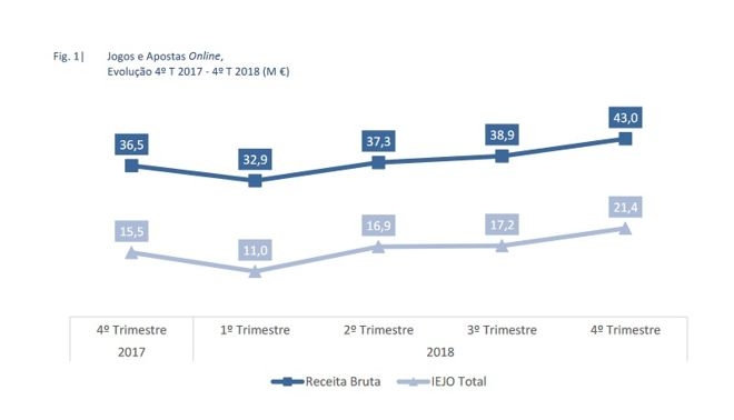 O Serviço de Regulação e Inspeção de Jogos (SRIJ) divulgou ontem, 20 de fevereiro, os dados relativos à atividade do jogo online em Portugal no 4º trimestre de 2018. No total, foram gerados cerca de €43 milhões de receita bruta, mais €6,5 milhões em relação ao período homólogo do ano anterior (aumento de 17,8%).