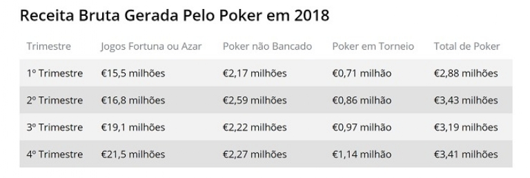 Para os €21,5 milhões de receita gerada pelos jogos de fortuna ou azar, que representam um crescimento de 12,5% em relação ao trimestre anterior, o poker contribuiu com cerca de €3,41 milhões (aproximadamente 16%).