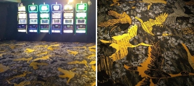 Os tapetes que eles escolheram no cassino têm o melhor desempenho que existe com a tecnologia atual. São confeccionados com 80% de lã virgem e 20% de nylon para aumentar sua resistência à abrasão, sem prejudicar a lã, suas características de resiliência, facilidade de limpeza e presença. Foram fabricado com fios tingidos em toda a sua estrutura (não só na superfície, eles não são impressos) e tricotados ponto a ponto, o que torna sua durabilidade e design da categoria mais alta.