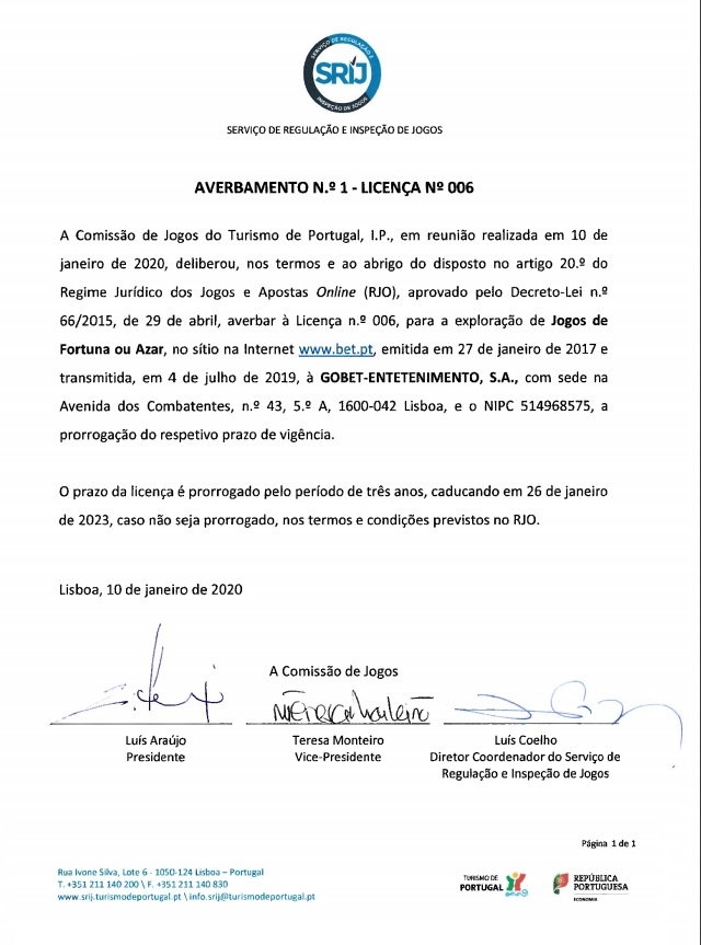 A primeira comunicação oficial do SRIJ no novo ano foi para anunciar que na reunião do dia 10 de Janeiro de 2020 foi deliberada e aprovada a renovação da sexta licença de jogo online que o regulador da atividade aprovou seis meses após a ser emitida a primeira licença à Bet.pt em Portugal, a meados de 2016.