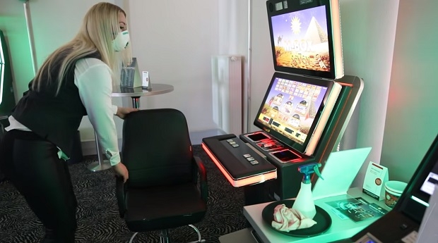 Nos salões de jogos da Renânia do Norte-Vestfália, é possível instalar no máximo 12 slots em uma área de aproximadamente 150 m² por sala. Além disso, é regulada a distância mínima entre dispositivos individuais, bem como o uso de telas, que podem servir como proteção de separação na situação atual e uma limitação no número de usuários (não há mais usuários do que máquinas na sala de jogos). Consequentemente, não há risco de infecção por multidões de pessoas ou contatos próximos.