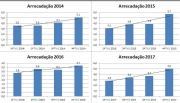 Nossos comentários neste artigo se restringem ao primeiro assunto e num próximo faremos as análises sobre o segundo. Comparando dentro de cada ano, trimestre a trimestre, os gráficos abaixo mostram que a evolução da arrecadação, ao longo dos trimestres de um mesmo ano, apresentam um pequeno - porém constante - crescimento e destaca o 4º Trimestre como o grande campeão.