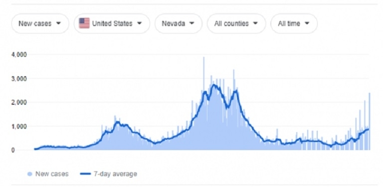 Fato é que o estado de Nevada, que tem 44% de sua população totalmente vacinada, tem visto aumento nos casos como pode-se observar no gráfico abaixo, do The New York Times, e isso provavelmente se deve à chegada da variante delta por lá.