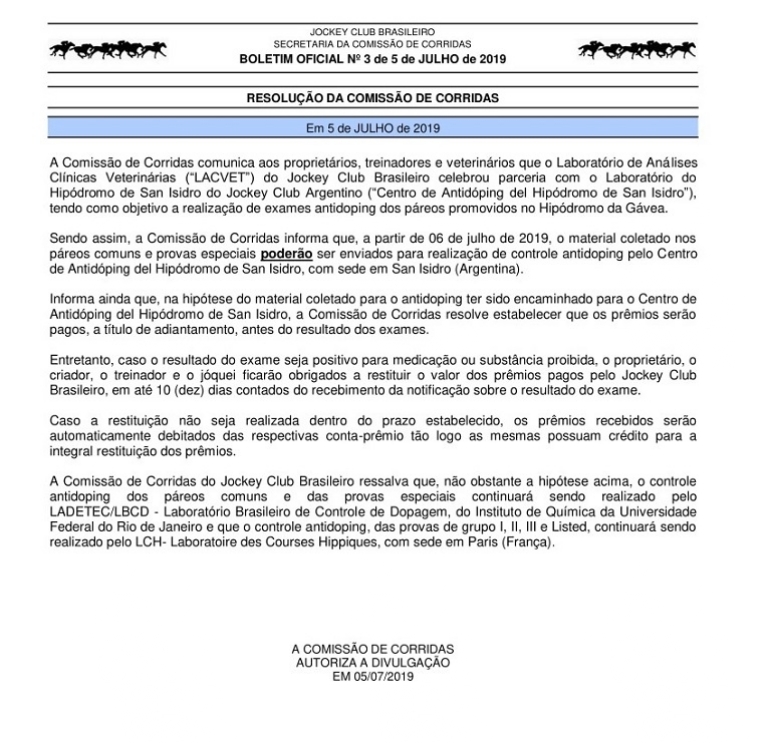 Em resolução da comissão de corridas do Jockey Club Brasileiro, foram divulgadas novidades em relação aos exames antidoping. De agora, em diante materiais coletados em páreos comuns e provas especiais poderão ser testados no Laboratório do Hipódromo de San Isidro do Jockey Club Argentino, com quem o Laboratório de Análises Clínicas Veterinárias (“LACVET”) do JCB celebrou parceria.